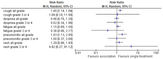 Safety is reported in 3 RCTs analyzing 821 patients. Maximum-grade 3 or 4 adverse events of any cause occurred in 31.3% of the patients in the ICI-RT group and in 25.9 % of those in the single treatment (26.1% in radiotherapy alone group and 25% in ICI alone). Discontinuation of the study treatment because of adverse events occurred in 14.1% of the patients in the associated treatment group and in 8.6% of those in the single treatment. No statistically significant differences were found between the most frequent adverse events (Figure 7).