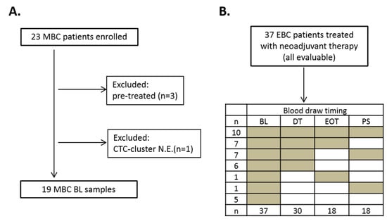 CONSORT plot reporting patients included in the study. (A) Metastatic breast cancer (MBC) patients (N.E. = not evaluable: BL = baseline); (B) Non metastatic breast cancer (EBC) patients: blood samples available at each time point are reported (BL = baseline; DT = during treatment; EOT = end of treatment; PS = post-surgery).