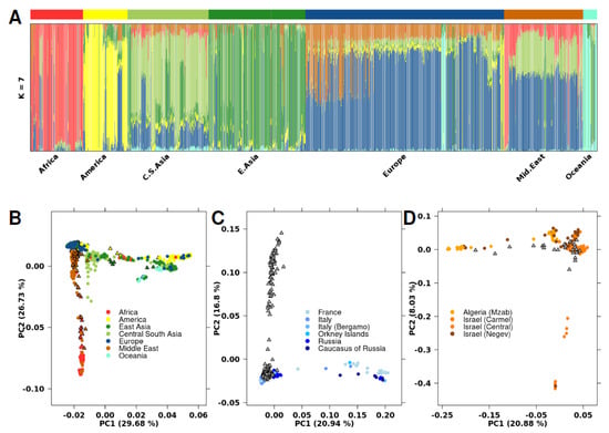 Three Middle Eastern samples in our dataset contained a larger than average proportion of the African primary admixture component (Figure S4). We performed principal component analysis (PCA) using 63,320 SNPs to investigate genetic diversity (Figure 1B). PC1 and PC2 explained 30% and 27% of genetic variance, respectively, with PC1 distinguishing East from West populations, while PC2 divided African/Middle Eastern populations from non-African populations. PCA of specific geographical regions showed sub-structures within the larger populations, including within specific regions of Europe and the Middle East (Figure 1C,D). As previously reported [22,23], Middle Eastern and European populations have divergent genetic ancestry.