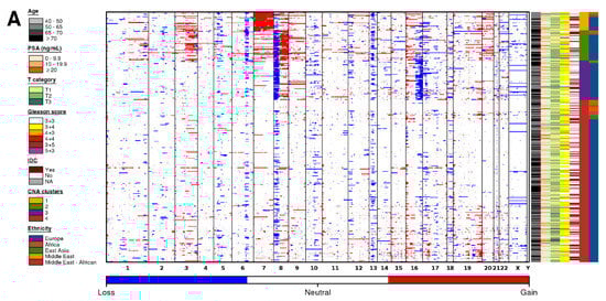 In conclusion, tumors arising in men of ME ancestry had fewer CNAs and lower PGA than those in men of other ancestries. There was no difference in the proportion of global CNA subtypes between the different ancestry groups, although there were differences in the proportions of CNAs in specific genes. Therefore, ancestry should be considered when investigating and characterizing biomarkers and molecular signatures relative to disease progression, prognosis, and potentially therapeutic targeting. Despite our limited sample size, our results document significant differences in key genes associated with prostate cancer progression and aggressiveness. The data also suggest that germline–somatic interactions may be at play in tumors arising in men of different ancestries. Further multi-omic studies of tumors arising in men of different ancestry are clearly warranted.