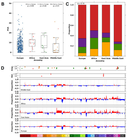 The median tumor arising in men of European ancestry contained 18 amplifications and 29 deletions. Tumors arising in men of East Asian ancestry had a similar number of CNAs (20 amplifications + 33 deletions; p = 0.16; Man-Whitney test). By contrast, tumors arising in men of Middle Eastern ancestry had fewer CNAs (7 amplifications + 11 deletions; p = 0.014; Mann-Whitney test), and those arising in men of African ancestry had the most CNAs (45 amplifications + 27 deletions; p = 0.016; Mann-Whitney test). As expected, the smaller number of CNAs in tumors from men with Middle Eastern ancestry led to lower global genomic instability, measured as the percentage of genome altered (PGA; Figure 2B). Tumors in men with Middle Eastern ancestry had lower PGA (median = 1.93%) than those arising in men of European ancestry (median = 6.45%; p = 1.07 × 10−2; Mann-Whitney test). There was no difference in PGA between tumors from men with African ancestry despite the larger number of aberrations (median = 9.72%) or tumors from men with East Asian ancestry (median = 6.83%).