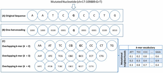 Neighborhood feature representations: A diagram representing the features derived from the neighborhood nucleotide sequences of the point mutations for an arbitrary window size of 4 is shown here. The mutated position is represented as a triplet (chromosome: position: substitution type). (A) The original sequence is represented here with the mutated nucleotide (ch17:109889:G > T) in bold. (B) One-hot encoding was used to derive the 4-bit binary one-hot encoded vector for each nucleotide. (C) Overlapping k-mers of sizes 2, 3, and 4 have been represented here. In this case, the neighborhood features also include the wild-type nucleotide at the mutated position. The overlapping k-mers were encoded into a numerical format using the Count Vectorizer and the TF-IDF Vectorizer, and the resulting word matrix was derived. The samples (or individual neighborhoods) are represented as rows, and the k-mers are represented as columns. The chromosome number and the substitution type (A > T, G > C, etc.) were included as additional features for both types of feature representation.