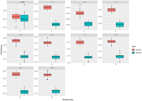 We estimated the driver and passenger neighborhood sequences’ underlying probability distributions using kernel density estimation. We computed the Jensen–Shannon (JS) distance metric to understand how “distinguishable” they are from one another. The JS metric is bounded between 0 (maximally similar) and 1 (maximally dissimilar). Table 1 shows the feature representations with the maximum median JS distances from the KDE experiments for various window sizes. We observed that, for the Brown et al. dataset [39], the maximum significant () median JS distance between passenger and driver neighborhood distributions, calculated across 30 runs of bootstrapping experiments, was 0.275 (for a window size of 2). However, there was no significant difference in terms of the median JS estimates calculated for window sizes 5 to 10 (Mann–Whitney U test; p < 0.05) using the different feature representations. Figure 2 shows the variation in the JS distances between the original and the randomized KDE experiments for window sizes between 1 and 10. As evident from Figure 2, except for window size 1, all other window sizes had a significant JS distance value ().