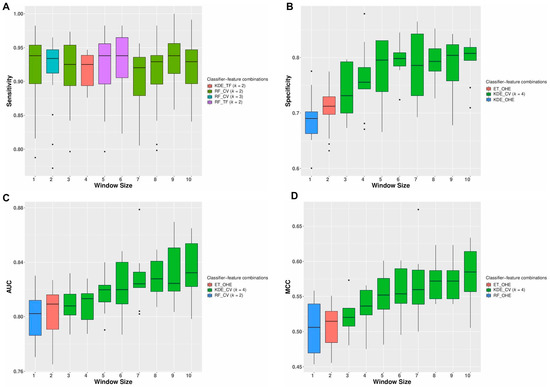 We ran the 10-fold cross-validation experiments (Figure S1A,B) three times for each such pair, thereby obtaining 30 values for each classification metric: sensitivity, specificity, AUROC, and MCC. The top five feature-classifier combinations in terms of the overall median value and the 95% CI for each of the above metrics were reported. To study the variation in classification performances with the addition of more nucleotides (or increase in window size), we repeated the Wilcoxon signed-rank test on the best performance metrics for all 45 pairs of window sizes , where and . The ci() from the gmodels package [51] in R was used to calculate the 95% CIs for the various classification metrics.
