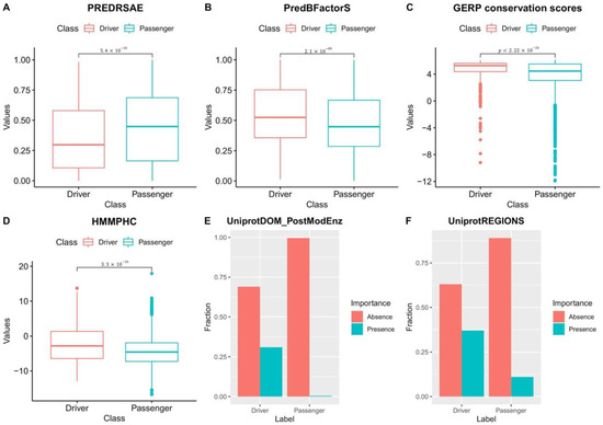 Our feature selection results from the external validation experiments reaffirm the observations made by Mao et al. [27] in terms of the differences in the underlying biological processes governing driver and passenger mutations. Using the training data used to build NBDriver, we found that driver mutations tend to occur on amino acid residues that have stiff backbones and have less solvent accessibility as denoted by the significantly lower (Wilcoxon test; ) PREDRSAE probability measure (Figure 4A) and the significantly higher (Wilcoxon test; ) ‘PredBFactorS’ probability measure (Figure 4B) respectively. We also observed that a mutation is more likely to be a driver if it occurs in genomic regions that were evolutionarily conserved. The mean GERP score for driver mutations was significantly higher (Wilcoxon test; ) than that of passengers (Figure 4C). Similarly, driver mutations were more common in genomic sites that had a significantly higher (Wilcoxon test; ) positional hidden Markov model (HMM) conservation score (or HMMPHC) as compared to passengers (Figure 4D). Among the other features, we observed similar class-wise distributional differences among features indicative of protein domain knowledge. UniprotDOM_PostModEnz denotes the presence or absence of a mutation in a site within an enzymatic domain responsible for post-translational modification (or PTM). PTM-related mutations are often accountable for changes in protein functions and alterations of regulatory pathways, eventually leading to carcinogenesis. UniprotREGIONS is another binary feature that tells us whether a mutation occurred in an experimentally defined region of interest in the protein sequence, such as those associated with protein–protein interactions and regulation of biological processes. Our analysis pointed out that a considerable portion (31%) of driver mutations clustered around PTM sites, contrasted by around 0.4% of passengers (Figure 4E). Similarly, about 37% of driver mutations were located in protein domains that were experimentally defined as regions of interest compared to around 11% of passengers (Figure 4F). Mao et al. [27] observed similar distributional differences among features such as the UniprotDOM_PostModEnz, UniprotREGIONS, GERP, PREDRSAE, and PredBFcatorS while trying to derive a cancer type-specific mutation effect prediction tool. They concluded that these results underscore the similarities and dissimilarities between the different cancer types and are indicative of the underlying mutagenic mechanisms.