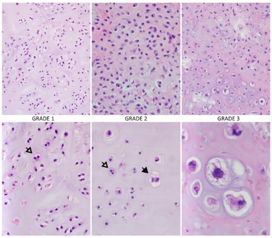Macroscopically CHS is a large tumor, usually greater than 4 cm in size, with translucent lobular, blue-grey, or white cut surface corresponding to the presence of hyaline cartilage [27]. Microscopically, atypical chondrocytes with an irregular shape, size, and condensed binuclear nuclei with the necrosis area are observed [28]. Due to the production of the blue-grey cartilage-matrix by CHS, irregularly shaped and sized lobules of cartilage, separated by fibrous bands, are often found [28]. Liquefaction of the chondroid matrix and myxoid changes in higher-grade CHS are also frequent [28]. Other commonly observed features are the calcification areas, with the granular matrix consistence arising as a result of bone destruction by chondroid tissue. In contrast, nonmineralized areas have a translucent appearance [27]. Calcified areas in CHS suggest the enchondroma origin, but the differentiation is possible based on the relationship of the presence of cartilage tissue to the surrounding trabecular bone [27]. Microscopical features important in distinguishing between enchondroma and central CHS can also be higher cellularity, irregular distribution of the cells, and presence of binuclear [20]. According to histological differentiation, conventional CHS has 3 grades [20,27] (Figure 1):