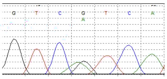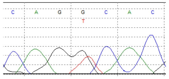 Somatic mutation in isocitrate dehydrogenase 1 (IDH1) in chondrosarcoma. G > A transition at nucleotide position 395, in codon 132, leading arginine to histidine substitution (p.Arg132His). Fluorogram by Andrzej Tysarowski.