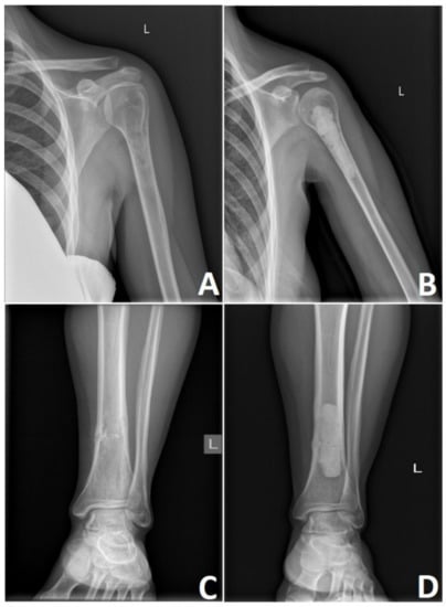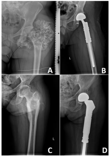 High-grade CHS lesions of the long bones usually require resection followed by limb-sparing surgery. This involves reconstruction with a modular endoprosthetic replacement, custom-made prosthesis, or bone graft reconstruction (Figure 8). In rare occasions, the size or location of these tumors necessitates a more radical approach where amputation of the affected limb remains the treatment of choice. Bingold has reported one of the first resections of the long bone in CHS, followed by a custom-designed prosthetic replacement. After resection of the proximal femoral low-grade CHS, he reported prosthetic reconstruction that spans across 43 years with several revisions [136]. Nowadays, prosthetic replacements for low-grade CHS are advocated only in locally advanced lesions where curettage or marginal resection is not an option. Prosthetic reconstruction in high-grade CHS remains to be standard with multiple options available [136,137].