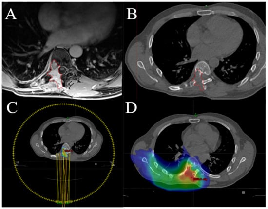 Stereotactic body radiotherapy (SBRT) for in-field recurrent high-grade mesenchymal chondrosarcoma (confirmed in next-generation sequencing sarcoma panel). In 2015, the patient underwent neoadjuvant chemotherapy followed by surgery, adjuvant radiochemotherapy (50.4 Gy in 1.8 Gy fractions with vincristine and dactinomycin combination chemotherapy), and chemotherapy according to EIAO regimen (etoposide, ifosfamide, vincristine, and dactinomycin). In 2019, he experienced local recurrence (LR) in the paraspinal area, which was resected in 2020. Five months later, the second LR was observed (A,B). The patients received SBRT (C) planned on fusion with magnetic resonance imaging and previous treatment plan (D). Volumetric arc therapy was used to deliver 30 Gy in five fractions prescribed on 80% isodose (C). Cord tolerance doses were compliant with the report published by Sahgal et al. [162]. Photos by Mateusz J. Spałek.