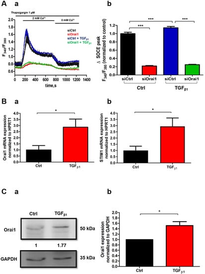 2.5. TGFβ1 Promotes Orai1-Mediated Ca2+ Entry and Increases Both Orai1 mRNA and Protein Expression in Human-Activated PSCs