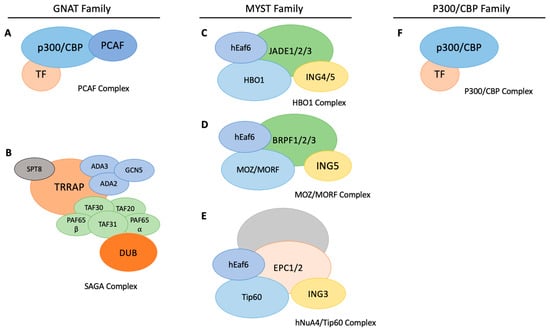 Examples of known KAT complexes from various KAT families. (A) The PCAF complex is composed of a DNA-binding transcription factor, p300/CBP, and bound to it is the GNAT-family KAT, PCAF. (B) The SAGA complex belongs to the GNAT family and uses GCN5 as the histone acetyltransferase. (C) The HBO1 complex is composed of the HBO1 histone acetyltransferase, ING4/5 as the histone-binding subunit, and JADE1/2/3 for scaffolding. (D) The MOZ/MORF complex is composed of MOZ/MORF acetyltransferase, BRPF1/2/3 for scaffolding, and ING5 for binding histones. (E) The hNuA4/Tip60 complex is composed of the Tip60 acetyltransferase, ING3 histone-binding subunit, and scaffolding subunit EPC1/2. The unlabeled structure behind EPC1/2 refers to variable components that are known to change depending on biological/cellular context. (F) p300/CBP complex is composed of a transcription factor that acts as a DNA-binding element and brings p300/CBP acetyltransferase to the chromatin.