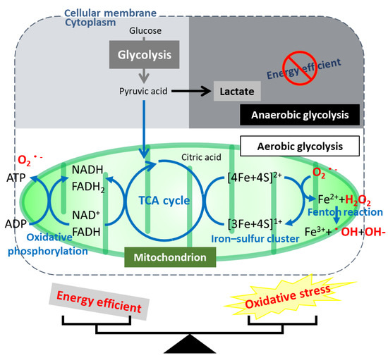 Why does the Warburg effect occur in ovarian CCC? Aerobic metabolism occurs in the mitochondria (Figure 1), which produce energy in an efficient electron transfer system by regulating the TCA cycle. However, when mitochondria work, they generate oxidative stress through the Fenton reaction using catalysts called iron–sulfur clusters [62]. Cells maintain a balance between energy efficiency and oxidative stress generation regulated by mitochondria in order to survive (Figure 1). Mitochondria are, so to speak, a “double-edged sword”. In CCC cells, anaerobic metabolism is activated, whereas aerobic metabolism is suppressed, suggesting the suppression of mitochondrial function (data in press). It is thought that they deliberately use anaerobic metabolism, which is less energy efficient, to survive in stressful environments. Mitochondrial metabolism enhances chemosensitivity in human ovarian cancers [63]. The reason why they use inefficient anaerobic metabolism is that the suppression of mitochondrial function suppresses oxidative stress in mitochondria, which is thought to be related to chemoresistance. Mitochondria play a crucial role in ferroptosis [64,65,66]; therefore, we believe that resistance to chemotherapies and ferroptosis could be overcome by activating mitochondrial function as a novel attractive therapeutic target in ovarian CCC. Targeting mitochondria itself using iron chelator results in the inhibition of the proliferation and induction of cell death via interfering with the iron metabolism and destabilizing the mitochondria in cancer cells [67].