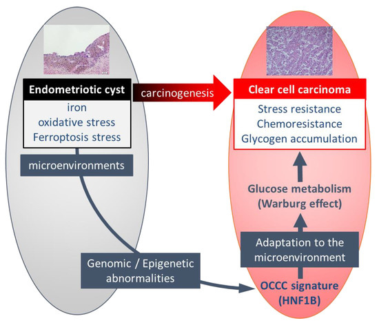 Ovarian cancer is the worst gynecologic malignancy and includes heterogeneous histological and biomolecular features [1,2,3]. Clear cell carcinoma (CCC) of the ovary is the second most common ovarian cancer, after high-grade serous carcinoma in Japan, and exhibits unique characteristics, including endometriosis, slow growth, association with thromboembolism, glycogen accumulation in the cytoplasm, and poor prognosis in advanced cases due to chemoresistance [4,5,6,7,8,9,10]. The unique epidemiology and clinical behavior of ovarian CCC raise three clinical questions. First, why does ovarian cancer, especially CCC and endometrioid carcinoma, occur frequently in endometriotic cysts? Second, why is endometriosis-related ovarian cancer more associated with specific histological subtypes, including CCC and endometrioid carcinoma, and why do distinct histological subtypes arise in endometriotic cysts? Third, why does ovarian CCC have unique characteristics? Recently, the molecular biological features of CCC have been reported using next-generation sequencing technology. Mutations in AT-rich interacting domain-containing protein 1A (ARID1A) and phosphatidylinositol-4,5-Bisphosphate 3-Kinase Catalytic Subunit alpha (PIK3CA) genes have been found in approximately half of the cases [11,12,13]. There are single-nucleotide polymorphisms (rs11651755) in the hepatocyte nuclear factor-1-beta (HNF1B) gene, which is highly expressed in ovarian CCC [14,15]. In addition, a detailed mutation status during each process of endometriosis-related carcinogenesis has been reported [11,12,13]. Interestingly, there are similar gene mutations in the orthotopic endometrium and ovarian endometriosis [16,17], and the possibility of carcinogenesis due to two hits in the ovary, as the same mutation has been found in eutopic endometrium, endometriotic cyst, and ovarian CCC [16]. Thus, the development of CCC has rapidly been understood from genetic analysis; however, the reasons for CCC being more frequent in endometriosis-related ovarian cancer and its unique characteristics are not clear. This review describes the roles of the carcinogenic environment leading to the development of CCC in endometriotic cysts and highlights the importance of metabolic regulation in sculpting the unique biology of ovarian CCC. Regulation of metabolism contributes to energy homeostasis from the onset of life. The tumor microenvironment can be considered a battlefield between cancer and host defense, competing for energy supply and metabolism [18]. Because mitochondria have been fundamental in evolution to produce energy, cancer cells utilize mitochondria for survival. In this review, we hypothesize that the evolution of ovarian CCC is a reason for the metabolic alterations that occur in ovarian CCC.