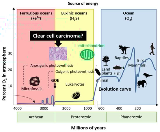 Evolution of life. Based on energy production, ovarian clear cell carcinoma seems to show evolution or reversion because of traditional energy metabolism. GOE: great oxidation event.
