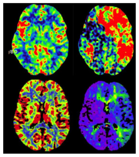 Perfusions imaging studies showing pre-operative cerebral blood volume and time-to-peak (top) and post-operative cerebral blood volume and time-to-peak (bottom).