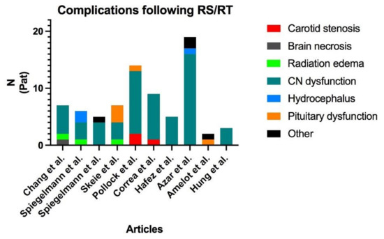 Distribution of the complications found in the review of the literature. Two publications reported no complications ([9,18]) and are, therefore, not shown in the figure. Cranial nerve dysfunction is by far the most frequent complication, and carotid stenosis is marginal. RS: Radiosurgery; RT: Radiotherapy; CN: Cranial nerves; Pat: Patients.