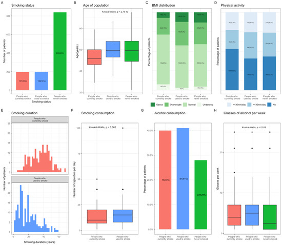 The distribution of smoking status at BC diagnosis was as follows: patients who currently smoke, n = 197 (16%), patients who used to smoke, n = 198 (16%), and patients who never smoked, n = 839 (68%) (Figure 1A). The patients who currently smoke were significantly younger than the patients who used to smoke or those who have never smoked (currently smoking: 52.7; used to smoke: 60.2; never smoked: 58.7, p < 0.001, Figure 1B and Figure S3). They were also more likely to be of normal weight or underweight (71.6%) than patients who used to smoke (57.5%) and those who have never smoked (59.1%) (Figure 1C, p < 0.001), and to have no physical activity at all (currently smoking: 52.3%; used to smoke: 40.4%; never smoked: 42.2%, Figure 1D). The median duration of smoking was 35.6 years in patients currently smoking, which was greater than that in patients who used to smoke (Figure 1E), although the total exposure to tobacco smoking in these two groups was similar (Figure 1F). The patients who never smoked drank alcohol both less frequently and in smaller quantities than those who currently or used to smoke (Figure 1G).