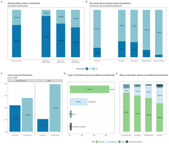 Smoking assessment and counseling by health care professionals at the time of BC diagnosis. (A), Smoking assessment reported in electronic health records (EHR) among the whole population and according to smoking status at diagnosis. (B), Smoking discussion during consultations with health care practitioners and according to each specialist (Surgeons, Oncologists, Radiotherapists, Anesthesiologists). (C), Discussion on tobacco consumption according to cancer type. (D), Information type provided by health care professionals. Subcategories were: general advice on smoking cessation (Must stop); treatment complications (Complication); practical advice and orientation (Advice and orientation) and Other. (E), Information type according to each specialist. Abbreviation: BC, breast cancer; EHR, electronic health records; BMI, body mass index.