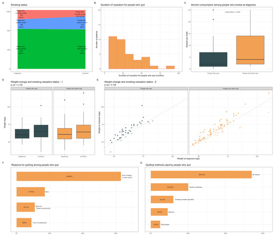 Overall, 33% (n = 65) of the patients who currently smoke at BC diagnosis had quit smoking after diagnosis (Figure 3A), for a median of 17.5 months (Figure 3B). The patients who quit had lower levels of alcohol consumption (2 glasses per week vs. 4, Figure 3C), but no other factor related to tumor characteristics or treatments received was associated with smoking cessation (Table S3). While the occurrence of the discussion was not associated with the duration of follow-up, smoking cessation was significantly associated with the duration of follow-up. This finding is consistent with the cumulative probability of a given individual being exposed to an event. In this vein, the long follow-up required in BC represents contact points to the healthcare system to reassess regularly smoking status and offer smoking cessation (Figures S4 and S5). Median weight increased between diagnosis and study inclusion (+2.7 kgs), but changes in weight did not differ significantly between the patients who quit and those who had not (Figure 3D,E), p = 0.106. The main reason for stopping smoking was fear of relapse (63%) (Figure 3F). Most of the patients who quit did not use any specific method for quitting (n = 35, 54%)), thirteen used nicotine substitutes, eight consulted a smoking cessation specialist, six used hypnosis, and three had psychological support (Figure 3G).
