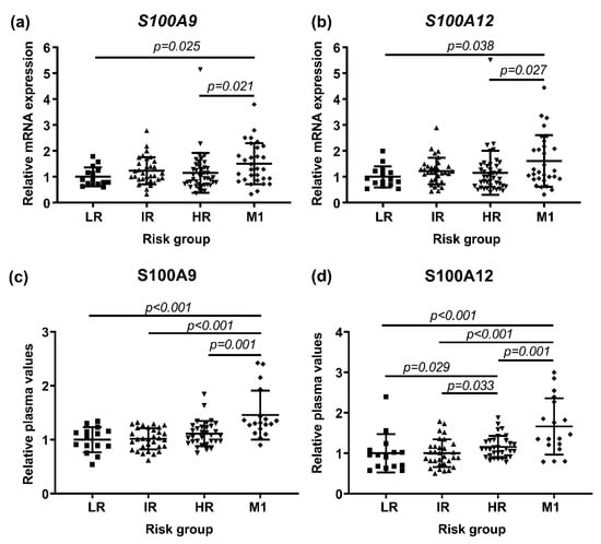Evaluation of S100A9 and S100A12 according to patient risk group at diagnosis, stratified as low risk (LR), intermediate risk (IR), high risk (HR) and metastasis (M1). Shown are the relative mRNA levels of S100A9 (a) and S100A12 (b) in PBMCs; LR (n = 15), IR (n = 32), HR (n = 42), M1 (n = 30) and relative plasma protein levels of S100A9 (c) and S100A12 (d); LR (n = 15), IR (n = 31), HR (n = 32) and M1 (n = 18). Each dot represents one individual and horizontal bars indicate mean values with standard deviation. Group comparisons were performed using Kruskal–Wallis followed by the Mann–Whitney U test. Significant p-values from the Mann–Whitney U tests are indicated.
