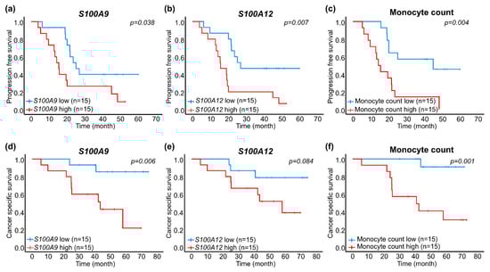 Kaplan–Meier survival analysis with the log-rank test showed that patients with high mRNA expression (>median value) of S100A9, S100A12 or a high monocyte count (>median value) had significantly shorter progression free survival than patients with low expression or low count (≤median value) (Figure 2a–c). Importantly, patients with high S100A9 expression or a high monocyte count had significantly reduced cancer-specific survival compared to patients with low expression or low count (Figure 2d,f). A trend for reduced cancer-specific survival was also seen in patients of S100A12 (Figure 2e).
