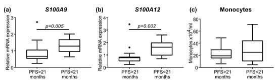 Short progression free survival (PFS < 21 months, n = 15) compared to long progression free survival (PFS > 21 months, n = 15) for patients with metastases at diagnosis. The relative gene expression levels of S100A9 (a) and S100A12 (b), and monocyte count (c) are illustrated by box plots. Outlier values (o) and significant p-values from the Mann–Whitney U tests are indicated.