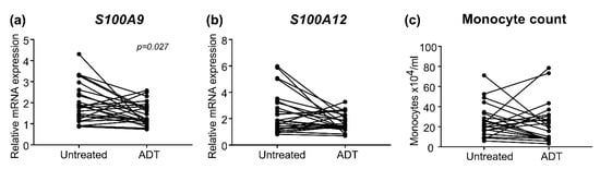To evaluate if ADT affected the mRNA expression levels of S100A9 and S100A12 or monocyte count, we analyzed blood samples collected from M1 patients (n = 24) approximately three months (median: 98 days, quartiles: 70–124 days) after treatment.