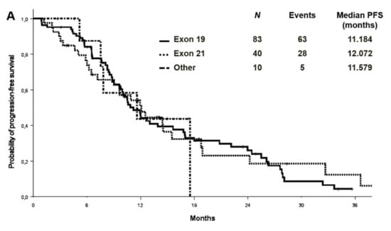 Patients with advanced NSCLC with activating EGFR mutations treated with TKIs at the Thoracic Oncology Unit of the AOU San Luigi Gonzaga (Orbassano) and, in case of first-line osimertinib, also at the Oncological Unit of the Mauriziano Umberto I Hospital (Turin) were included. EGFR mutations (exons 18–21) were detected by NGS (next generation-sequencing). Progression-free survival (PFS) was defined as the time interval from the start of EGFR TKIs treatment and disease progression or death. Overall survival (OS) was defined as the time from the start of cancer treatment and the patient’s death. Performance status (PS) was assessed according to the Eastern Cooperative Oncology Group (ECOG) score. The definition of treatment response and disease progression was determined by the investigators using the response evaluation criteria in solid tumours (RECIST) version 1.1. The date of the last follow-up corresponded to 30 January 2021. Demographic data, data on smoking history, PS and clinical outcomes were collected from medical records. The database used for the study included the following variables:
