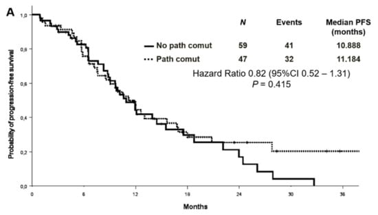 Based on recent literature, patients were defined as having co-mutations if they harboured mutations of pathogenic or unknown significance according to the COSMIC database and the FATHMM-MKL algorithm (available at https://cancer.sanger.ac.uk/cosmic, accessed on 15 April 2021). Therefore, patients with co-occurring benign mutations were considered without co-mutations. An exploratory analysis considering all patients with co-alterations (pathogenic or not) was also performed.