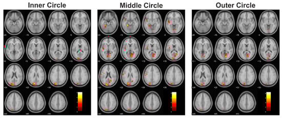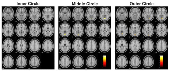 | Outer circle | 642 | 0.024 | 8.61 | 12 | −78 | 4 | CF (B), LG (B), Cuneus (R), Precuneus (R) | |