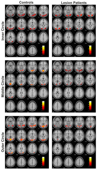 | Controls > Lesion | Inner circle | 912 | 0.004 | 8.23 | −16 | −82 | 26 | SOG (L), Cuneus (L), MOG (L), CF (L), SPG (L) |