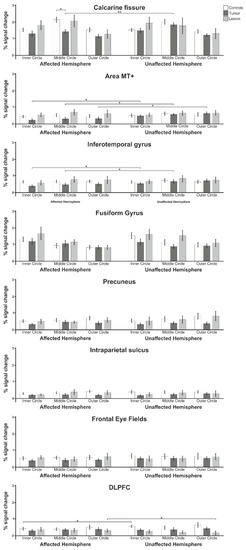 - Dumoulin, S.O.; Hoge, R.D.; Baker, C.L.; Hess, R.F.; Achtman, R.L.; Evans, A.C. Automatic volumetric segmentation of human visual retinotopic cortex. Neuroimage 2003, 18, 576–587. [Google Scholar] [CrossRef][Green Version]