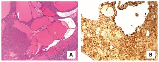 Besides renal cell carcinoma with TFEB translocation, TFEB-amplified renal cell carcinoma is a distinct group of tumors with amplification of the 6p21 locus harboring TFEB. The TFEB amplification (commonly observed by fluorescence in situ hybridization) leads, as downstream effects, to TFEB overexpression (Figure 2) [35,36,37,38,39]. These tumors usually occur in older patients compared with TFEB-rearranged renal cell carcinoma, and frequently demonstrate a high-grade/poorly differentiated morphology, often with oncocytic features, and aggressive behavior as an advanced local stage or metastatic disease [37,39,40,41]. The occurrence of TFEB amplification in renal cell carcinoma seems to not be related to TFEB rearrangement. Nevertheless, few cases of TFEB-rearranged renal cell carcinomas with concomitant TFEB amplification have been described [35,42]. TFEB expression in tumors with TFEB amplification is lower compared with TFEB-rearranged renal cell carcinomas. Moreover, among the latter, when the classic biphasic morphology was observed, a higher TFEB expression was reported [40]. However, for TFEB gene translocation, TFEB amplification results in TFEB hyperexpression and subsequent immunohistochemical labeling of cathepsin K [41].