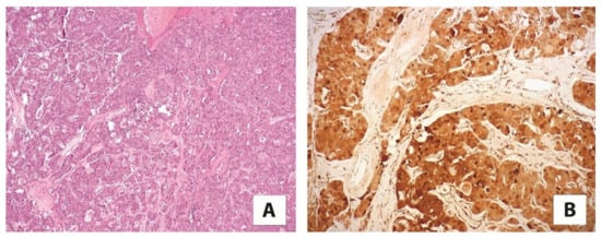 Eosinophilic solid and cystic renal cell carcinoma is a recently characterized entity that exhibits well-defined clinical, pathological, immunohistochemical, and molecular features [53,54]. It typically occurs in females as sporadic tumors and generally exhibits indolent behavior, although metastatic cases can occur, which imply patient surveillance. A hereditary form arising in patients with tuberous sclerosis complex has been documented. As the name indicates, the tumor is made up of voluminous eosinophilic cells with granular cytoplasmic “stippling” with round nuclei and not prominent nucleoli arranged in a solid and cystic architecture. Foamy macrophages, as admixed or in small clusters, are usually encountered. The somatic bi-allelic loss or mutually exclusive mutation of TSC1/TSC2 genes is the constant molecular alteration of such tumors [55,56], and has even been evaluated to be completely embedded in multiple samples of tumors [57]. Using immunohistochemistry, besides the cytokeratin 20 positivity/cytokeratin 7 negativity, staining for cathepsin K is reported, in either a diffuse or focal pattern (Figure 4) [58,59]. Again, TSC1/TSC2 gene mutation leading to the activation of mTOR pathway may explain cathepsin K immunohistochemical expression.