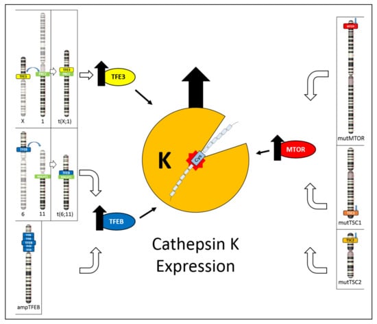 By exploring the novel insights into the cathepsin K expression, this review has the aim to highlight its usefulness in the differential diagnosis of renal tumors and to underline the relationship between cathepsin K and TFE3 translocations, TFEB translocation/amplification, and the cathepsin K and mTOR pathway (Figure 6). TFE3 hyperexpression resulting from TFE3 gene translocation and the overexpression of TFEB due to either TFEB gene translocation or TFEB gene amplification cause cathepsin K expression [49]. On the other hand, inactivating mutations of TSC1/TSC2 genes or activating mutations of the mTOR gene cause mTOR pathway activation, possibly resulting in cathepsin K expression [70,71,72].