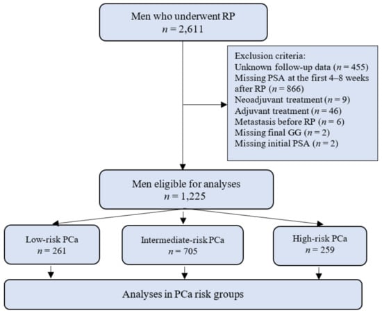 Between 2001 and 2019, 2611 men were treated by RP for clinically localized and locally advanced PCa at the Department of Urology of the Lithuanian University of Health Sciences. Patient data were registered in a PCa database. During the study period, RP was performed by 9 senior urologists. The exclusion criteria were as follows: no follow-up data, a patient did not have PSA measurement within the first 2 months after RP, neo- and adjuvant treatments, detected metastases before RP and incomplete clinical or pathological data. Patients were stratified according to undetectable PSA (PSA < 0.1 ng/mL) vs. persistent PSA (PSA ≥ 0.1 ng/mL) at the first measurement 4–8 weeks after RP. Furthermore, patients were divided according to the pathological PCa features into low-risk (pT2, GG1, PSA <10 ng/mL and Nx, pN0); intermediate-risk (pT3a, GG2–3, PSA 10–20 ng/mL and Nx, pN0) and high-risk (pT3b, GG4–5, PSA > 20 ng/mL and pN1) groups. Our study flowchart is presented in Figure 1. Tumor grading was classified using the revised 2005 International Society of Urologic Pathology (ISUP) Gleason score grading system and the suggested the new GG model after 2014 [16,17]. The university’s ethical committee approved the collection and analysis of the data.