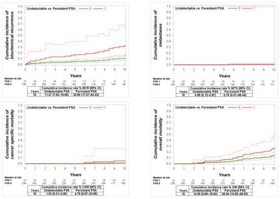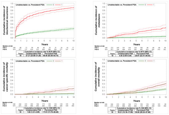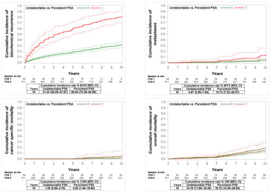 Cumulative incidence function for biochemical recurrence (BCR), metastases (MTS), cancer-specific mortality (CSM) and overall mortality (OM) in all study cohort patients with undetectable vs. persistent prostate-specific antigen (PSA).
