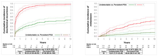 - Preisser, F.; Chun, F.K.H.; Pompe, R.S.; Heinze, A.; Salomon, G.; Graefen, M.; Huland, H.; Tilki, D. Persistent Prostate-Specific Antigen After Radical Prostatectomy and Its Impact on Oncologic Outcomes. Eur. Urol. 2019, 76, 106–114. [Google Scholar] [CrossRef]