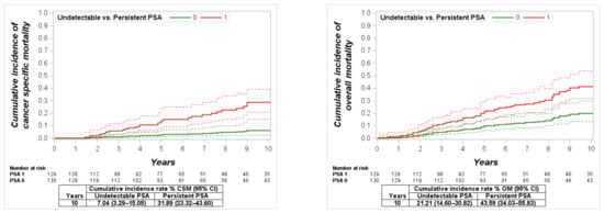 The mean persistent PSA in this group was 1.9 ng/mL (95% CI: 1.29–2.50), and the range was 0.1–24.6 ng/mL. The cumulative 10-year incidence of BCR, MTS, CSM and OM was significantly lower in men with undetectable PSA compared to men with PSA persistence: 50.3% vs. 98% (p < 0.0001), 12.8% vs. 49% (p < 0.0001), 7% vs. 31.9% (p < 0.0001) and 21.2% vs. 43.6% (p = 0.0001), respectively (Figure 5). Differently to other study groups, men with detected PSA persistence had a significantly increased risk of BCR (HR: 5.1, p < 0.0001), risk of MTS (HR: 2.6, p = 0.015), CSM (HR: 6.2, p = 0.007) and OM (HR: 2.7, p = 0.005) in the multivariate analysis (Table 3).