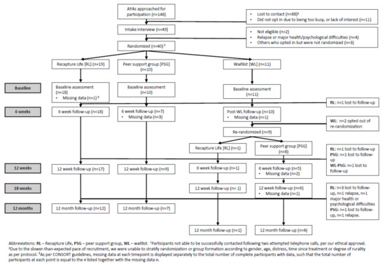 - Sansom-Daly, U.M.; Wakefield, C.E.; Bryant, R.A.; Patterson, P.; Anazodo, A.; Butow, P.; Sawyer, S.M.; McGill, B.C.; Evans, H.E.; Cohn, R.J.; et al. Feasibility, acceptability, and safety of the Recapture Life videoconferencing intervention for adolescent and young adult cancer survivors. Psycho-Oncology 2018, 28, 284–292. [Google Scholar] [CrossRef]