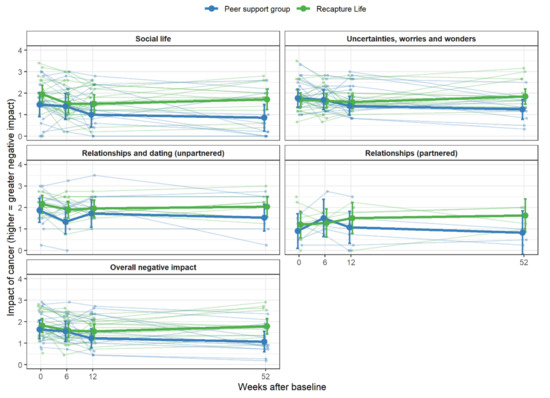 Differences between Recapture Life and peer-support group on negative impact of cancer, over time. Note. Individual scores are displayed, overlaid with thicker lines showing group-specific means and 95% confidence intervals. Three-way analyses comparing Recapture Life, peer-support group and waitlist are depicted in Supplementary Data S4).