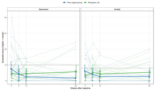 Depression and anxiety symptoms between Recapture Life and peer-support groups over time. Note. Individual scores are displayed, overlaid with thicker lines showing group-specific means and 95% confidence intervals. Dotted line indicates the upper end of ‘Normal’ range of symptoms on each subscale, with scores above this indicating Mild symptoms and above.