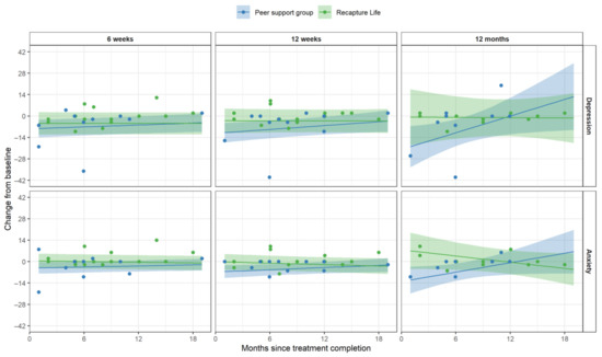 Between-group differences in change in depression and anxiety scores according to participants’ time since treatment-completion, across time-points. Note. Individual scores are displayed, overlaid with thicker lines showing group-specific means and 95% confidence intervals. Participants’ length of time since completing cancer treatment is represented along the X-axis (range: 0–18 months post-treatment); while each column of panels depicts data measured at different study time-points (6-weeks, 12-weeks, 12-months).