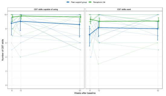As noted above, we undertook three-way analyses (Recapture Life vs. peer-support group control vs. waitlist control at 6 weeks post-intervention) and two-way analyses (Recapture Life vs. peer-support group control 12-month post-intervention).