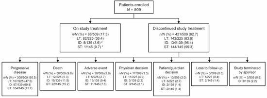 In this study, data for 509 enrolled patients were analyzed. Based on their observed treatment duration, 225 patients were categorized into the long-term duration of benefit group, 139 into the intermediate duration of benefit group, and 145 into the short-term duration of benefit group. At data cutoff (14 December 2018), 88 patients (17.3%) were on treatment, while 421 patients (82.7%) discontinued treatment (Figure 1). The most common reason for discontinuation across all three groups was PD (n of N = 308 of 509; 60.5%). Discontinuations in the short-term and intermediate duration of benefit groups were mostly due to PD (short-term, 104 of 145 (71.7%); intermediate duration, 97 of 139 (69.8%)), followed by death (short-term, 22 of 145 (15.2%); intermediate duration, 16 of 139 (11.5%)), and AEs (short-term, 11 of 145 (7.6%); intermediate duration, 13 of 139 (9.4%)). In the long-term duration of benefit group, there were notably lower discontinuations due to PD (107 of 225 (47.6%)), lower death rate (12 of 225 (5.3%)), and very low discontinuations due to AEs (6 of 225 (2.7%)).