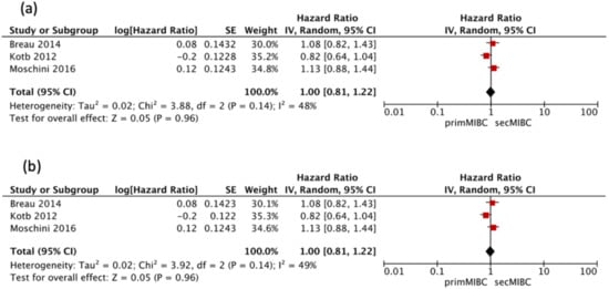 Four of these studies [,,,] were available for HR calculation of 10-year CSS between primMIBC and secMIBC. Pooled analysis showed no significant differences in 10-year CSS (pooled HR 0.95, 95% CI 0.63–1.43, p = 0.8), with significant heterogeneity between studies (Chi2 = 9.26, I2 = 68%, p = 0.03) (Figure 5b).