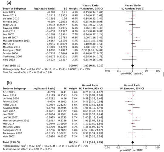 Sixteen studies [,,,,,,,,,,,,,,,] were available for HR calculation of 5-year CSS between primMIBC and secMIBC. Pooled analysis showed no significant difference in 5-year CSS (pooled HR 1.02, 95%CI 0.81–1.29, p = 0.85). However, there was significant heterogeneity between studies (Chi2 = 56.13, I2 = 73%, p < 0.001) (Figure 3a).