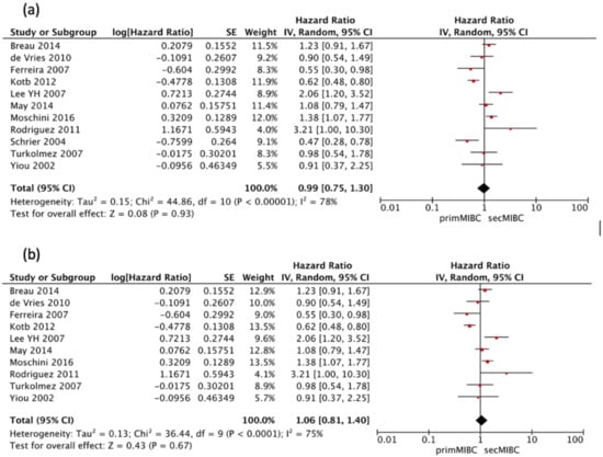 Eleven studies [,,,,,,,,,,] were available for HR calculation of 10-year CSS between primMIBC and secMIBC. Pooled analysis showed no significant differences in 10-year CSS (pooled HR 0.99, 95%CI 0.75–1.3, p = 0.93), with significant heterogeneity between studies (Chi2 = 44.86, I2 = 78%, p < 0.001) (Figure 4a).