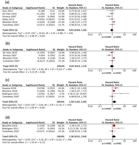 Four studies [,,,] that utilized neoadjuvant chemotherapy (NAC) were available for HR calculation of 5-year CSS (model VI) between primMIBC and secMIBC. Pooled analysis showed significant differences in 5-year CSS between studies (pooled HR 1.5, 95% CI 1.02–2.2, p = 0.04), without significant heterogeneity between studies (Chi2 = 5.64, I2 = 47%, p = 0.13) (Figure 5c).