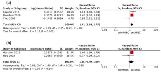 Three studies [,,] were available for HR calculation of 5-year PFS between primMIBC and secMIBC. Pooled analysis showed significant differences in 5-year PFS (pooled HR 1.41, 95% CI 1.14–1.75, p = 0.002) without significant heterogeneity between studies (Chi2 = 1.29, I2 = 0%, p = 0.53) (Figure 6a).